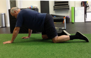 Start by moving one hand forward at the same time as you move your opposite knee forward. Then bring your other hand and opposite knee forward as you start to crawl. Sounds easy, but some people have a great deal of trouble synchronizing the opposite hand/knee movement at the same time, and then switching to the other arm/leg.